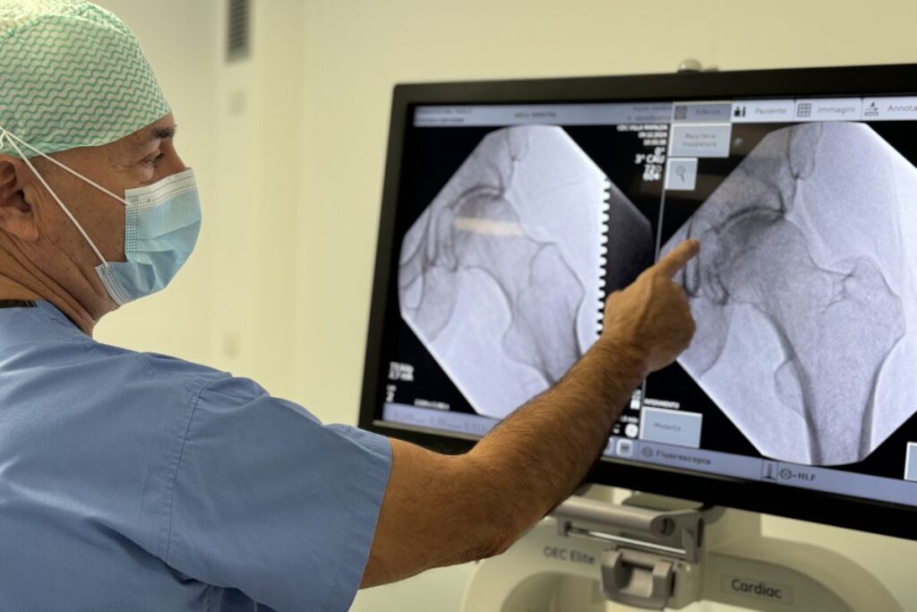 Il Dr. Riccardo Giacomi, per l’infiltrazione delle cellule mesenchimali nell’anca, non utilizza una tecnica ecoguidata, ma radioguidata. L’ago per l’infiltrazione viene inserito nella capsula articolare ed immette aria nell’articolazione. Ciò permette di visualizzare la semiluna articolare, dando così la certezza di trovarsi nella sede corretta per l’infiltrazione. A questo punto, la capsula viene gonfiata con insufflazione di aria e si esegue l’infiltrazione delle cellule mesenchimali nel punto migliore per alleviare i sintomi del paziente.
